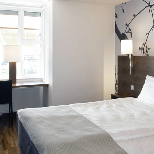 Lyse og komfortable rom i nordisk stil! Velg mellom dobbeltrom eller familierom for to voksne og to barn.